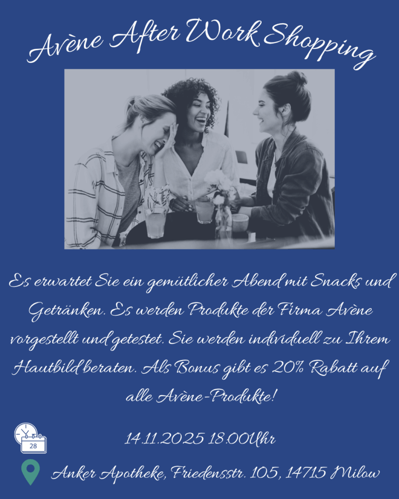 Zum zweiten Mal laden wir Sie recht herzlich zum Avéne After Work Shopping ein. In gemütlicher Runde mit Getränken und Snacks werden Sie passend zu Ihrem Hautbild beraten. Produkte der Firma Avène werden vorgestellt und getestet. Zusätzlich erhalten Sie 20% Rabatt auf das gesamte Sortiment von Avène. Um Anmeldung wird gebeten. Wir freuen uns auf Sie!