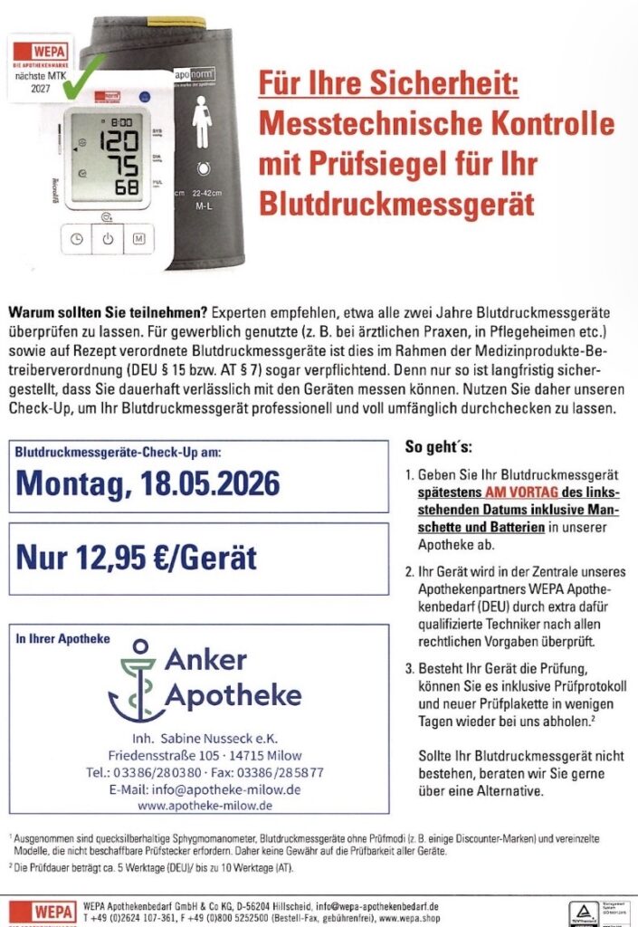Misst Ihr Gerät noch genau? Bringen Sie Ihr Gerät bis zum 16.05.2026 in unsere Apotheke und Sie erhalten es eine Woche später fachgerecht kontrolliert zurück.